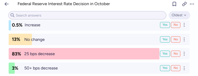 The consensus among traders is loud and clear: they expect the Federal Reserve to cut interest rates. An overwhelming 83% of the money in this market is betting on a quarter-point (25 bps) decrease.