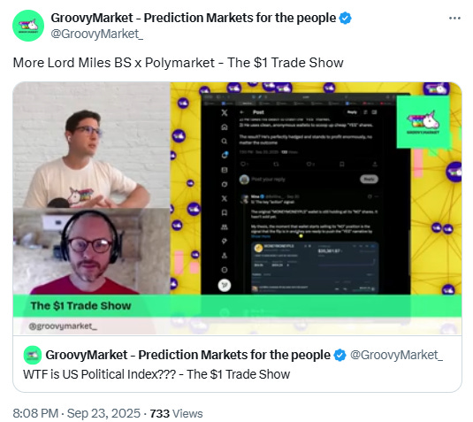 If you have insights on prediction markets and a knack for writing, we invite you to submit your work for consideration. Selected contributions will be featured in this newsletter, reaching an audience of over 1,000 engaged readers. Please send your piece to contribute@groovymarket.xyz.