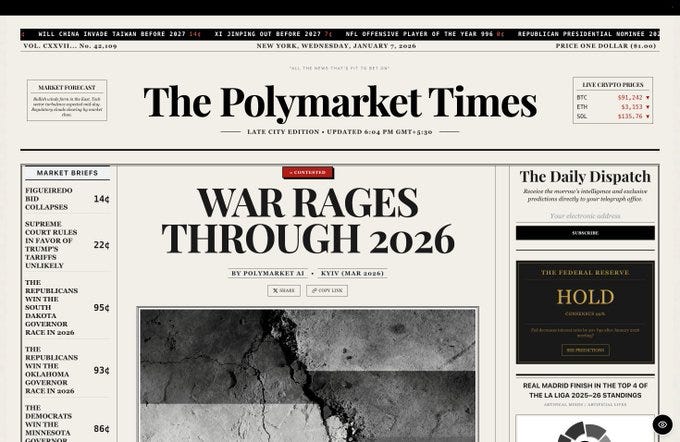 A newspaper-style front page powered entirely by real-time odds reframes prediction markets as information infrastructure. No commentary. No editorial layer. Just probabilities.