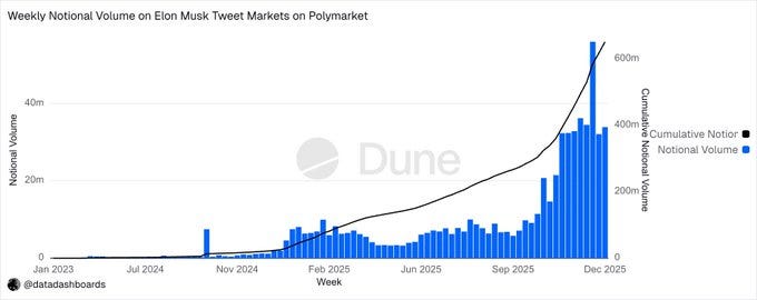 1.5% of Polymarket’s all-time volume comes from markets tied to Elon Musk’s tweeting behavior