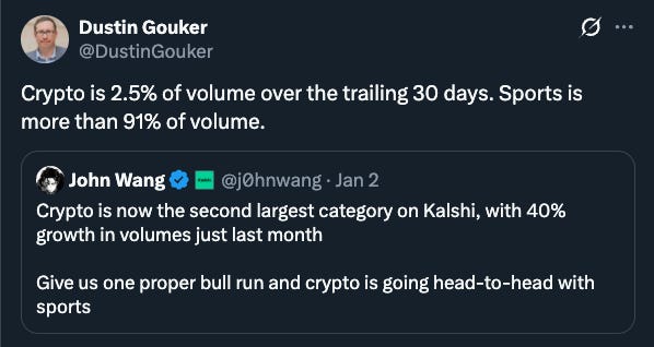 Crypto is now the second-largest category on Kalshi, posting 40% month-over-month growth. Despite that, crypto still represents only ~2.5% of total volume, with sports exceeding 90%.