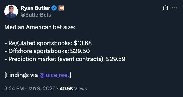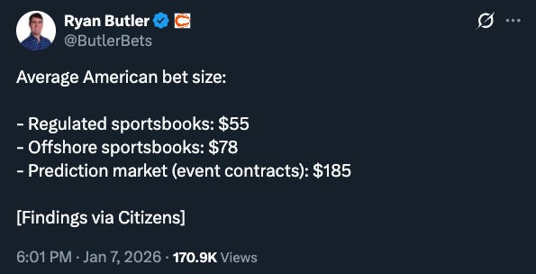 Prediction market users wager 2–3× more per trade than regulated sportsbook users