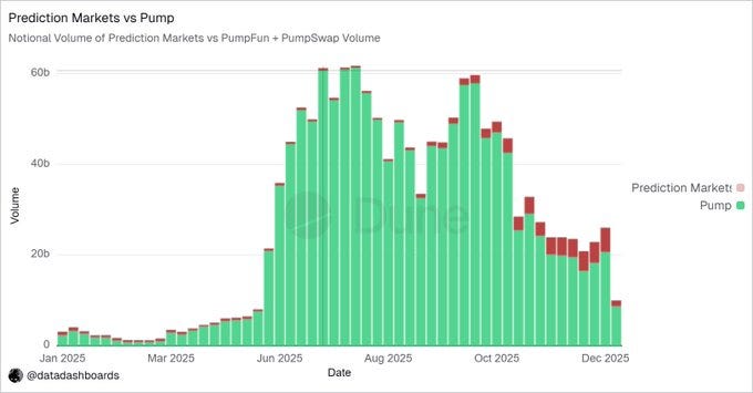 Last week marked the closest gap yet between prediction market volume and Pump.fun activity — though Pump.fun still processed roughly 4× more volume.