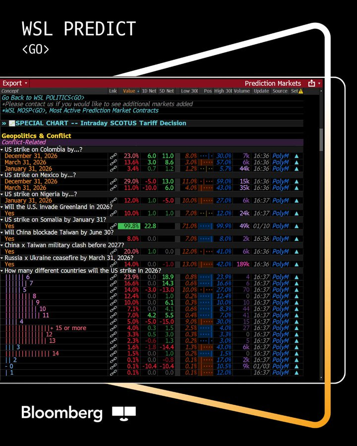 Bloomberg has begun surfacing prediction market data directly in its terminal, alongside traditional financial indicators. From Fed leadership probabilities to geopolitical outcomes, market-implied odds are being treated as legitimate signals.