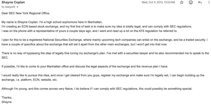 An email he sent to the SEC in 2013 — at age 16 — asking how to build legal prediction markets.