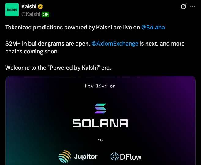 “Tokenized prediction markets powered by Kalshi are live on Solana.”