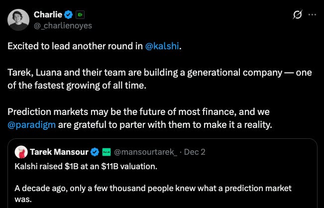 Charlie Noyes called Kalshi a “generational company”, putting prediction markets alongside L2s, perps, and DeFi as core strategic infrastructure.