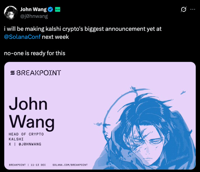3️⃣ John Wang teases “Kalshi’s biggest crypto announcement yet”