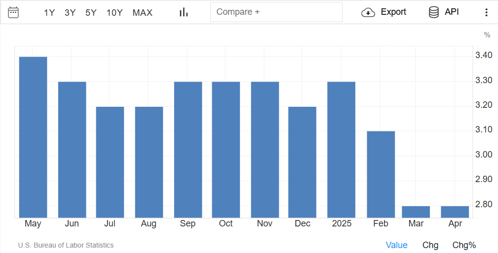 The latest available data indicates the US inflation rate (CPI YoY) was 2.3% in April 2025, down from 2.4% in March 2025. Moreover, the core inflation rate in the US stands at 2.8%, the lowest it has been in the last four years, per Trading Economics.