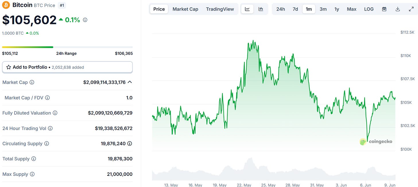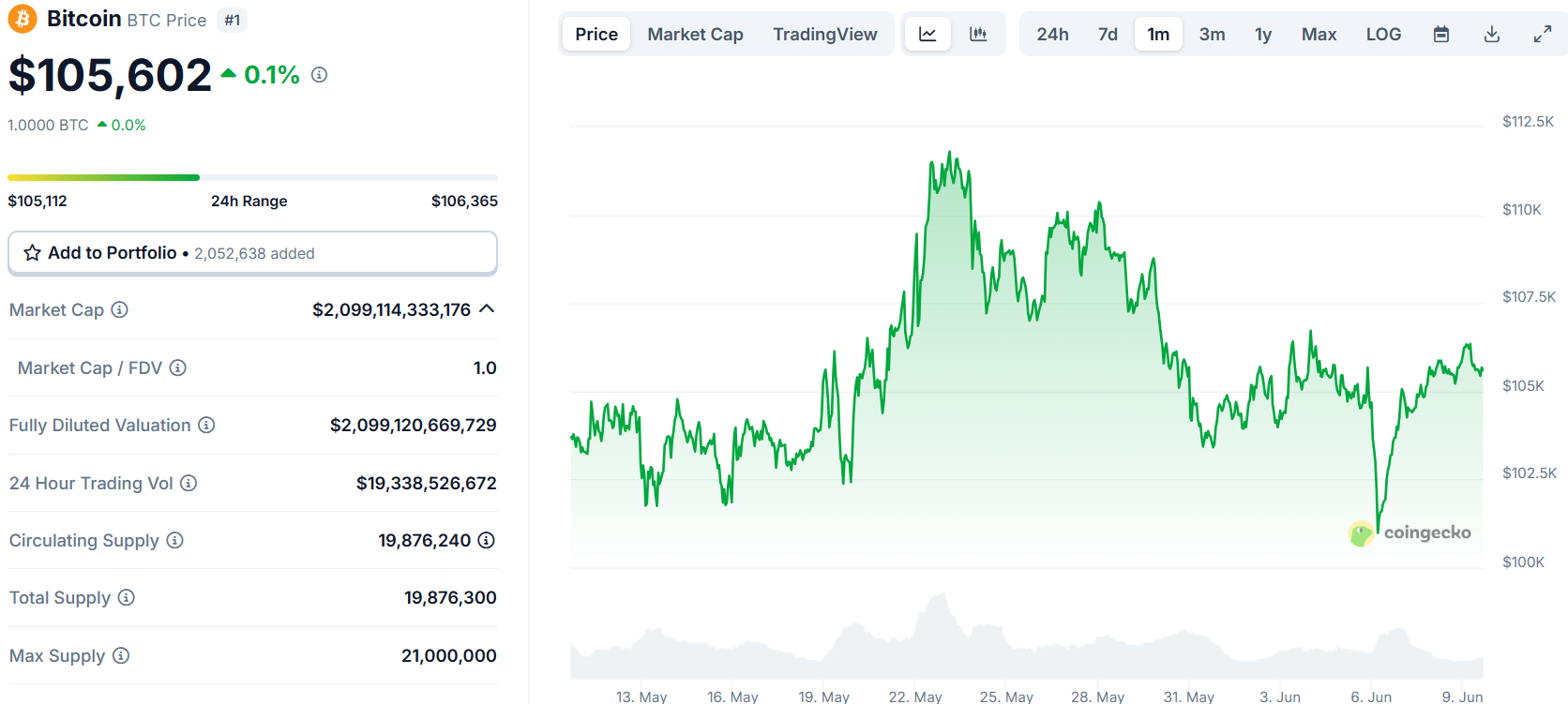 As of June 9, 2025, Bitcoin is trading around $105,602, with intraday swings between $105,110 and $106,368. BTC recently bounced to $104k, and CoinDesk warns that unless it crosses $107k, a bearish correction remains likely. 👀