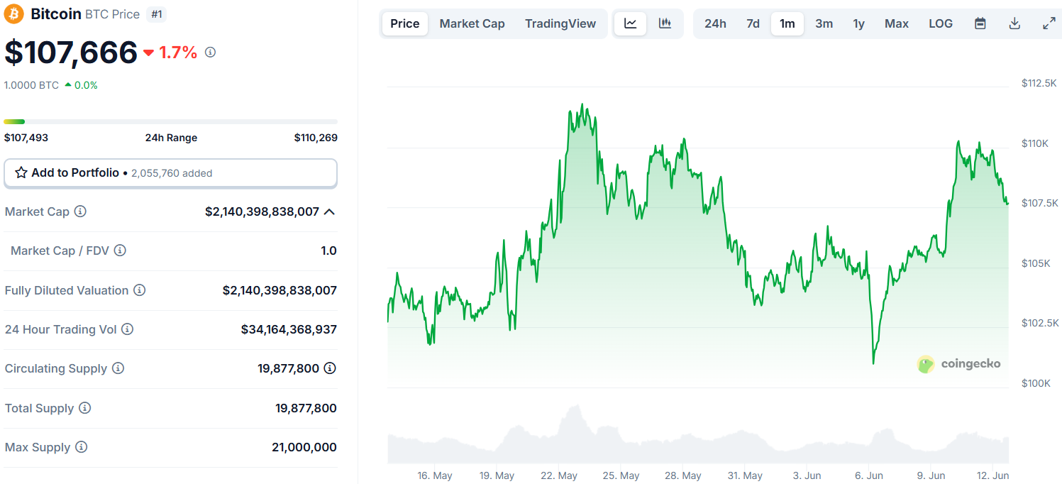 As of June 12, 2025, Bitcoin has gone down to $107,666.