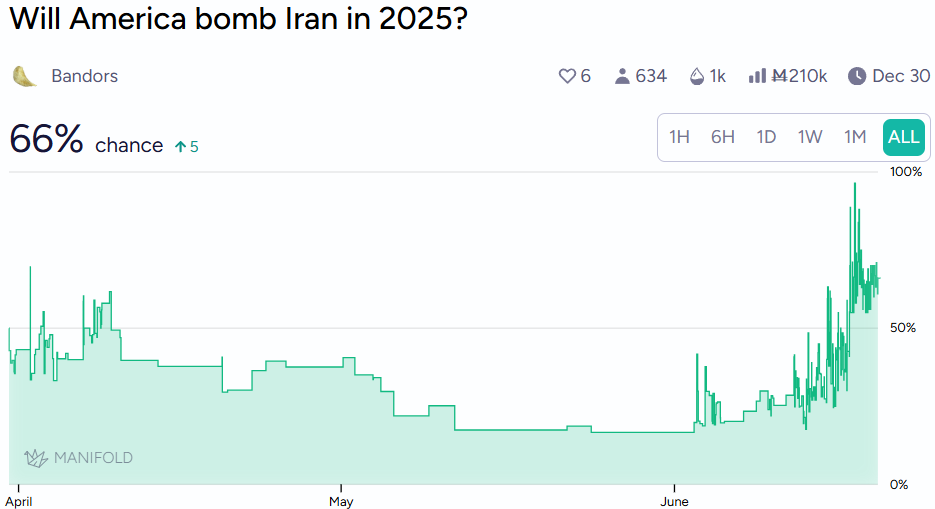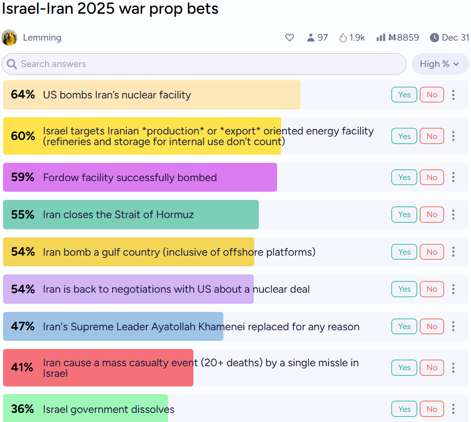 This market is circulating in other prediction platforms, too. On Manifold, it gets even more specific. They have a list of war prop bets between Israel and Iran. 👀