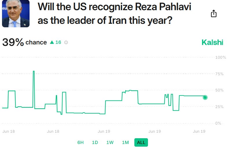 Interestingly, there are no similar markets in Kalshi. They do have a prediction game going on around Iran’s exiled Crown Prince Reza Pahlavi: