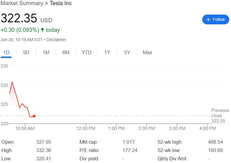 Based on the latest data, TSLA is trading around $322.35 (June 20, 2025). Year-to-date, Tesla’s stock is down 26% following a brutal 14% single-day drop this month.