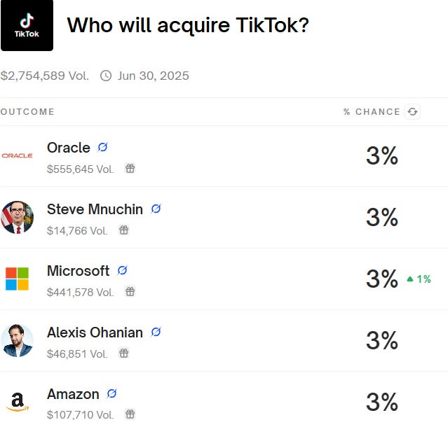 There’s also a market predicting TikTok’s ban before July, but there’s a high probability that this will close to a “No”. The traders’ money is now placed on the list of potential TikTok buyers.