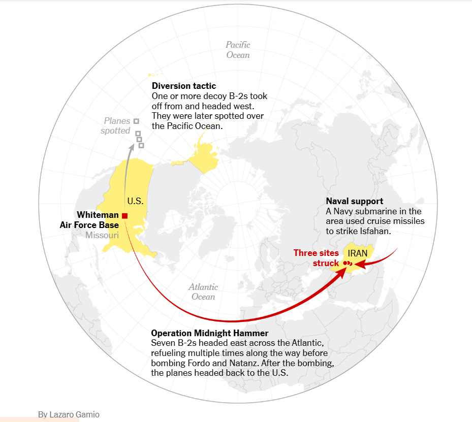 Above, you can see an illustration of how the United States carried out its airstrikes on Iran’s nuclear sites. Iranian Foreign Minister Abbas Aragchi pointed out that the American bombing was “extremely dangerous, lawless, and criminal behavior.”