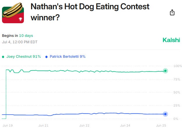 The Fourth of July is on the horizon, bringing us to the annual Nathan’s Hot Dog Eating Contest. This competition is drawing heavy interest from Kalshi traders, as influenced by Joey Chestnut’s return.