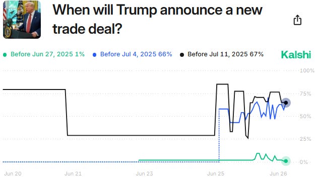 Traders on Kalshi are split but increasingly leaning toward July as the month Trump finally pulls the trigger on a trade announcement. This trend follows a top White House official's hint that a series of trade deals will be announced after July 4th.