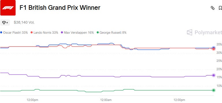 Polymarket traders are also placing their predictions on the iconic British Grand Prix this Sunday. Lewis Hamilton won the Silverstone race last year, but the charts are looking at a new winner this weekend.