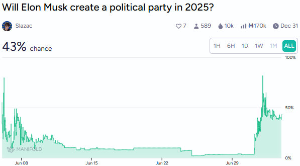On Manifold, traders are playing the long game on Elon’s political tantrums. They’re speculating whether Musk will create a new political party, and the odds are slightly optimistic.