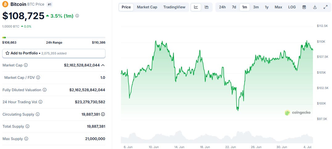 As of July 4, 2025, BTC is hovering around the $108K-$110K range. That’s looking good, right?