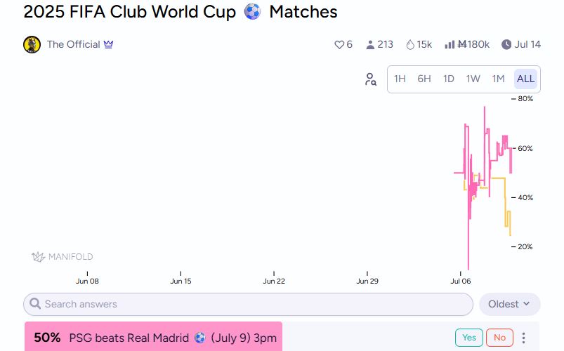 The PSG vs Real Madrid semifinal match in the 2025 FIFA Club World Cup is happening today. It’s generating massive interest in prediction platforms, including Polymarket, Kalshi, and Manifold.