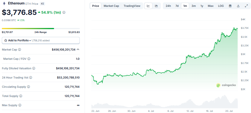 As of July 21, 2025, Ethereum (ETH) is trading around $3.7K. This impressive run is part of a nine-day winning streak, with ETH gaining over 26% in the last week and more than 50% in July alone.