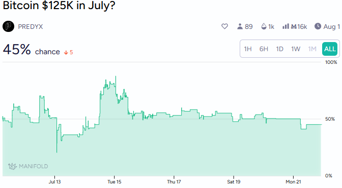 And most interestingly, Manifold traders are reflecting the same exact 45% probability of BTC reaching $125K this July.