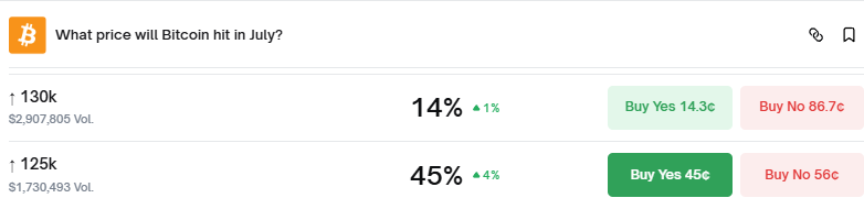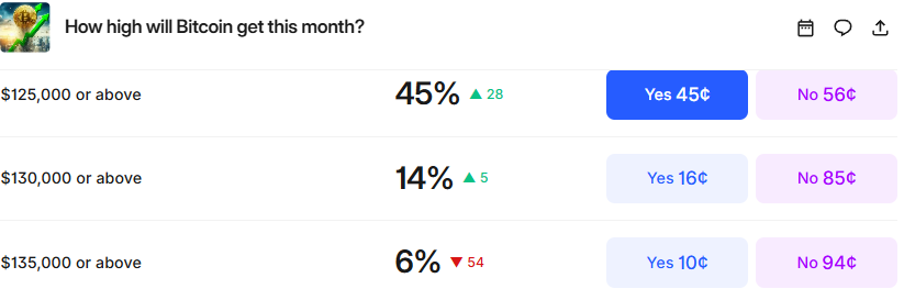 As such, prediction traders are taking a bullish stance on BTC’s price this month. On Polymarket, they’re giving Bitcoin a 45% chance to hit $125K.