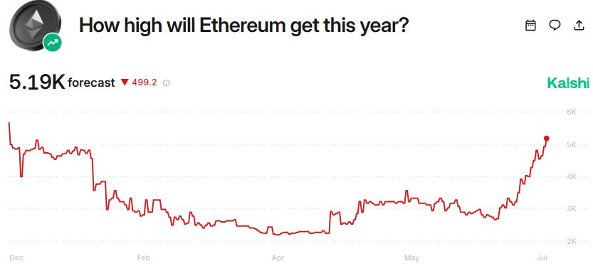 Naturally, prediction traders are active on Ethereum markets today. Kalshi traders are extremely bullish of ETH’s chances of breaking past the $4K barrier. They’re also giving it a 53% chance of hitting $5K this year.