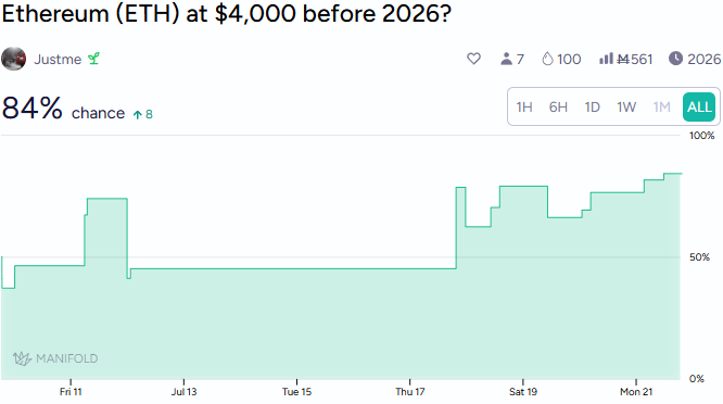 To reflect the similar sentiment, Manifold traders are giving ETH an 84% chance of hitting $4K in 2025.