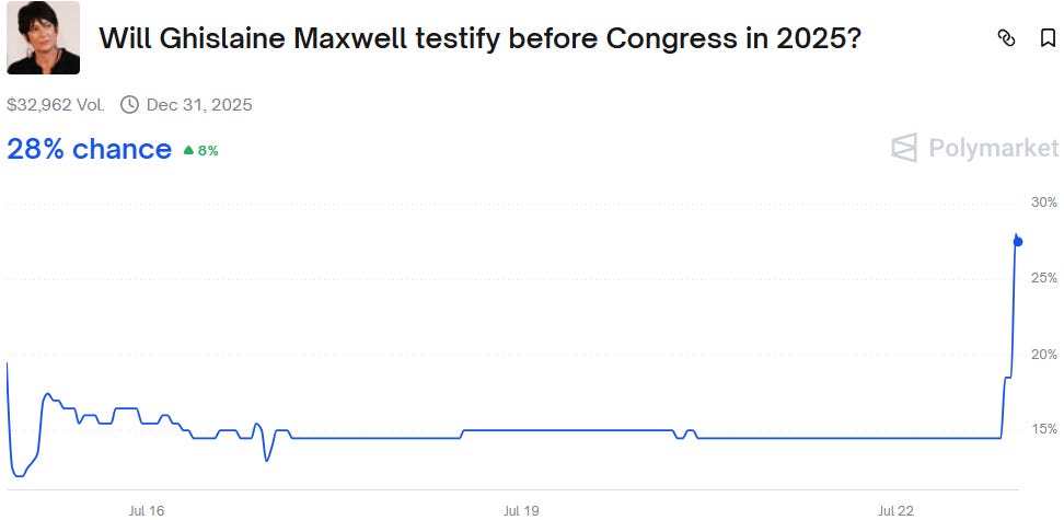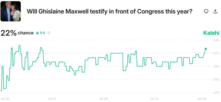 Kalshi traders are already on this market days before. Even with the potential meeting with the DOJ, they’re still placing a low probability on Maxwell testifying in front of Congress.