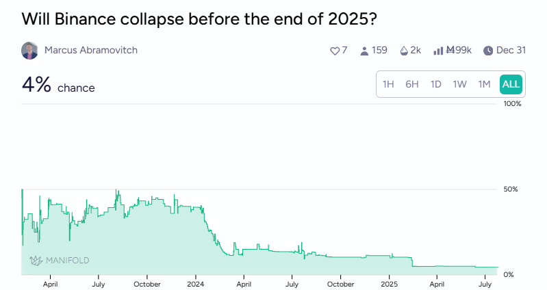 So, it’s not a surprise that prediction markets are bullish on Binance’s foreseeable potential. In fact, Manifold’s market on a possible Binance collapse is on its lowest probability today.