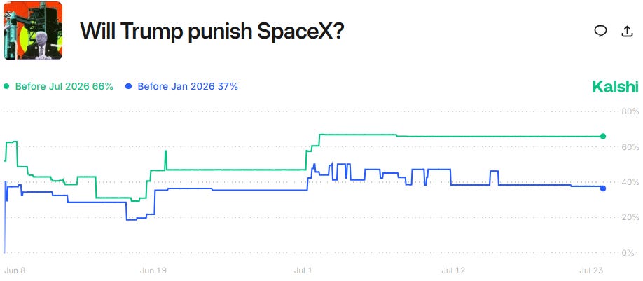 As such, prediction markets are speculating whether Trump will punish Musk’s SpaceX. Kalshi traders are already on it.