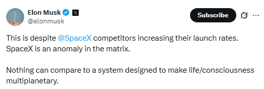 Moreover, SpaceX’s launch capabilities are still unmatched. Hear it from the man himself: