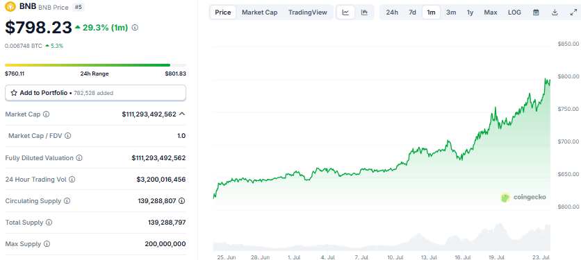 After breaching the $800 mark, BNB (Binance Coin) is now hovering at around $798.23.