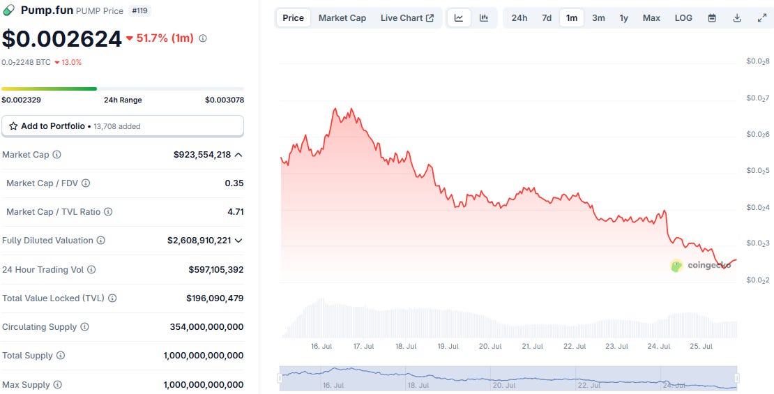 The once-hyped PUMP token has seen a dramatic downturn, plunging 45% from its July 16 peak. It’s a massive disappointment from the third-largest ICO in history, when it raised $500M for a $6B valuation.