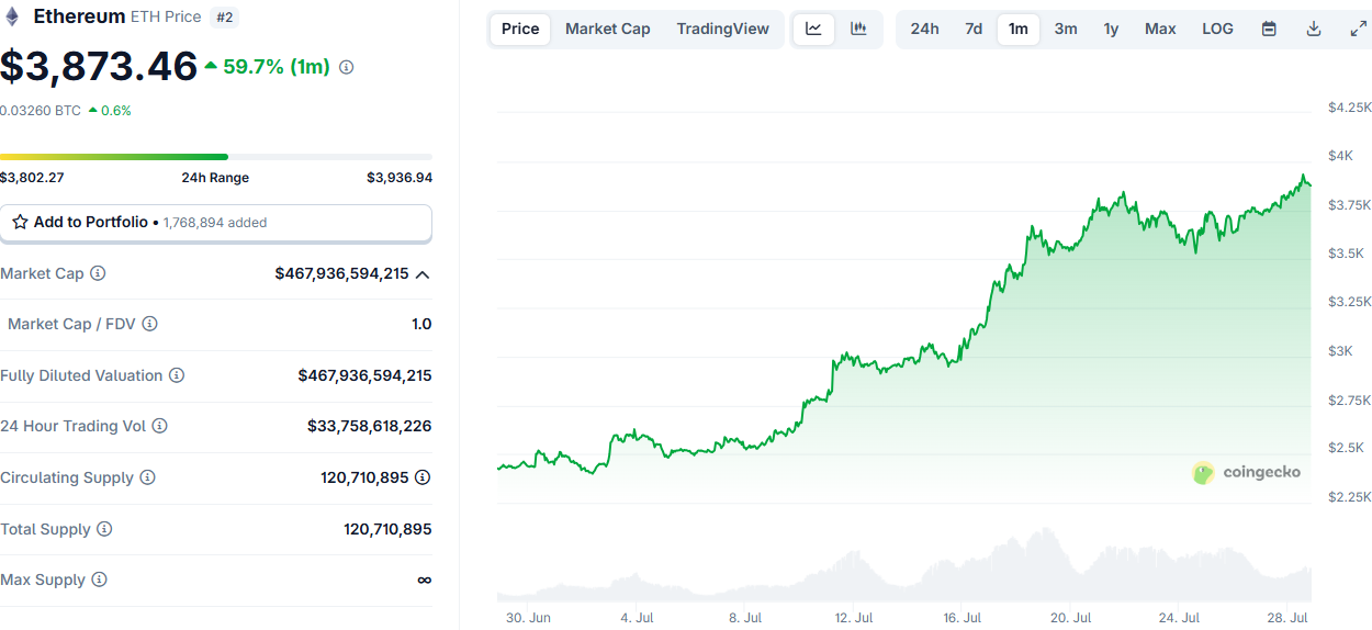 As of July 28, 2025, ETH is trading at around $3,873.46.