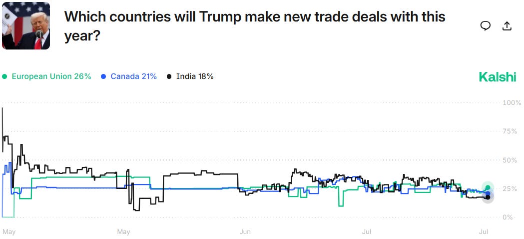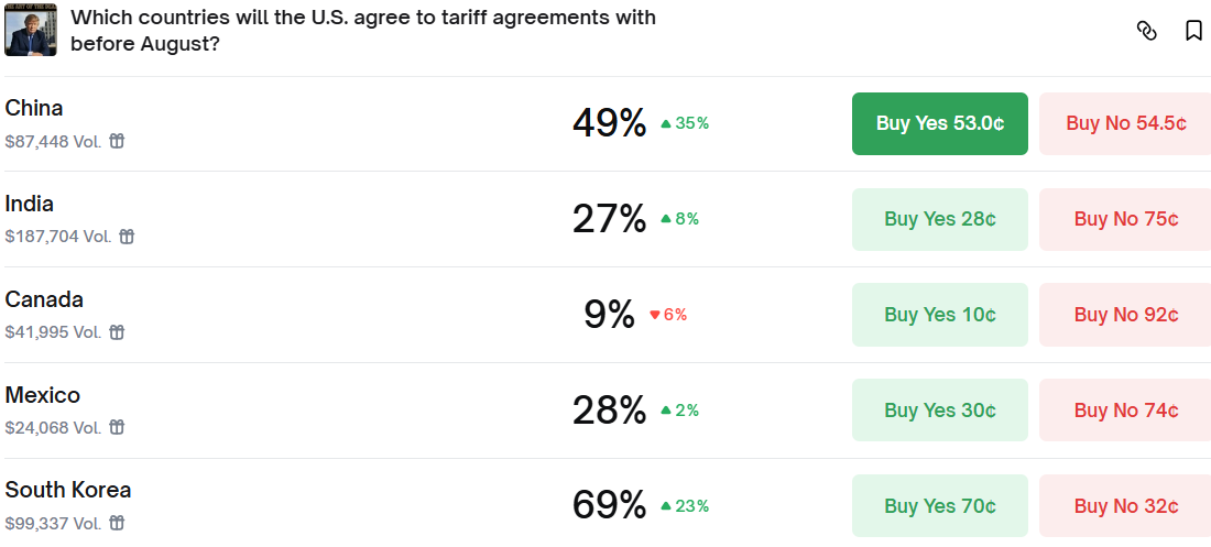 With the EU deal on the books, prediction markets are still speculating which countries will strike a trade deal with the US. On Polymarket, South Korea is leading the odds with 69%.