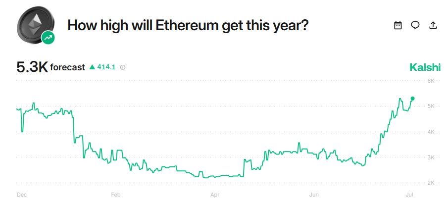 ETH breaching the $4,500 threshold is now at 70% probability on Kalshi, while the $5,000 option is at 54%.