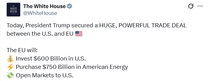 Markets woke up to history today as Trump announced the US and EU reached a framework for a trade deal. This ends the months-long saga between America and its largest trading partner. 💯