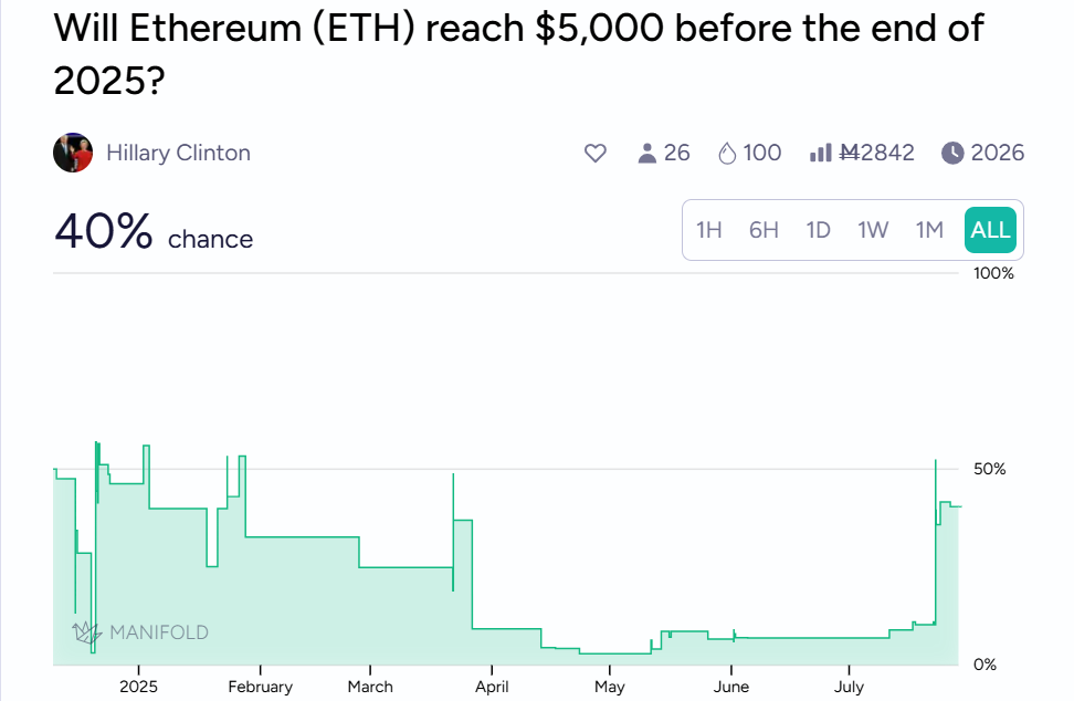 On Manifold, you can predict whether Ethereum will hit $5,000 before October 2025. Traders are now giving this market a 40% chance to resolve to “Yes”.