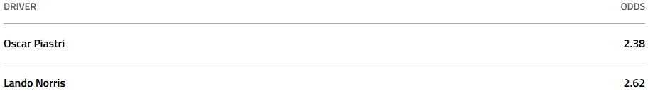 So far, Polymarket traders are bullish on a McLaren duel (yet again). Oscar Piastri and Lando Norris are leading the predictions: