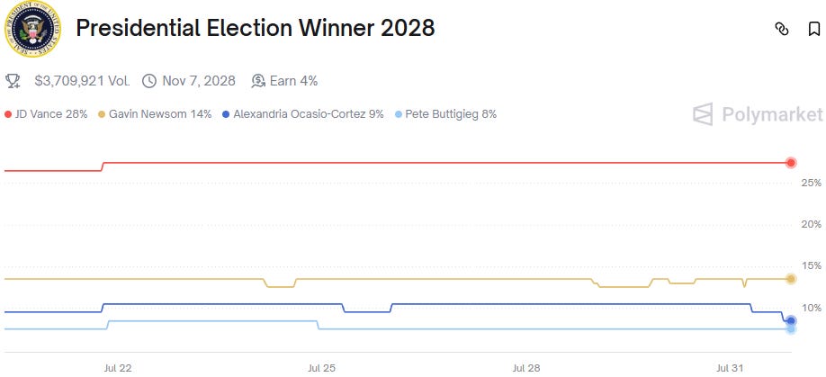 In fact, Newsom is trailing JD Vance in Polymarket’s predictions for the 2028 presidential election winner.