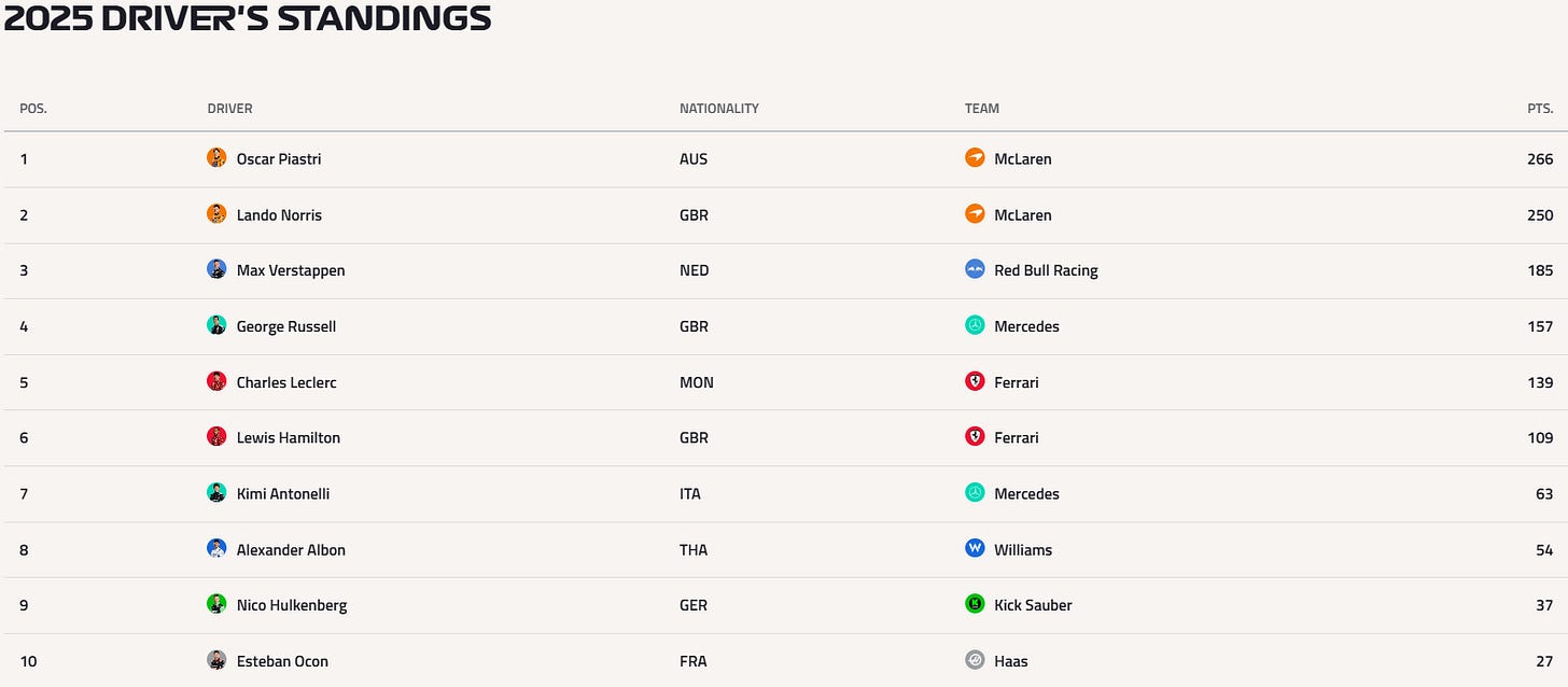 Piastri is now leading the Driver’s Standings by 16 points over Norris. Here are the Top 10 drivers heading into the final race before the summer break: