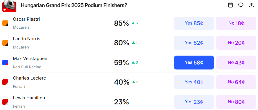 On Kalshi, you can also predict which drivers will finish on the podium. Essentially, you can choose three options.
