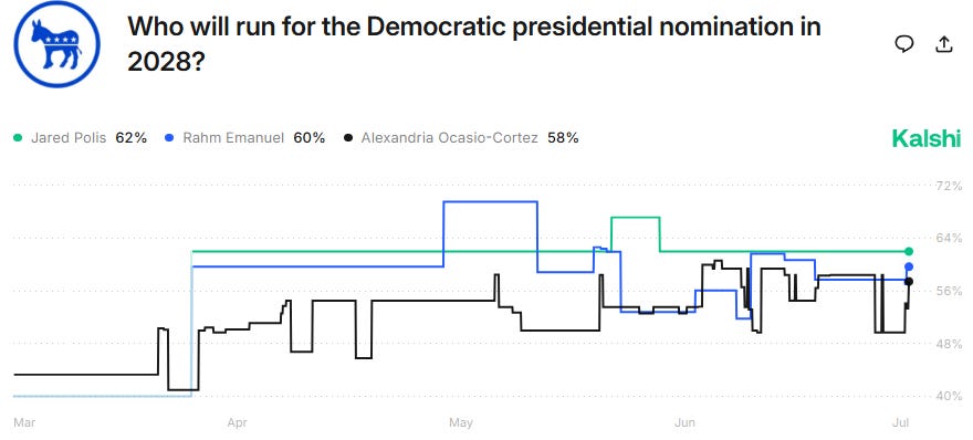 However, Harris’s probability is still way lower than the top options. Gavin Newsom still leads this race on Kalshi: