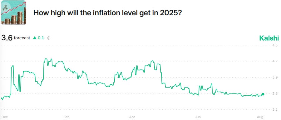 On Kalshi, the 3% CPI market is already resolved to a “Yes”. That leaves the 4% range as the frontrunner, with a 17% probability.