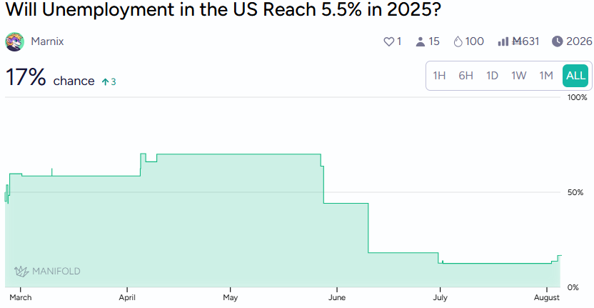 Manifold traders are also predicting whether the unemployment rate will reach 5.5% in 2025. They’re giving it a 17% chance. It’s not a high probability, but it is still noticeably higher than the 13% probability at the start of July 2025.
