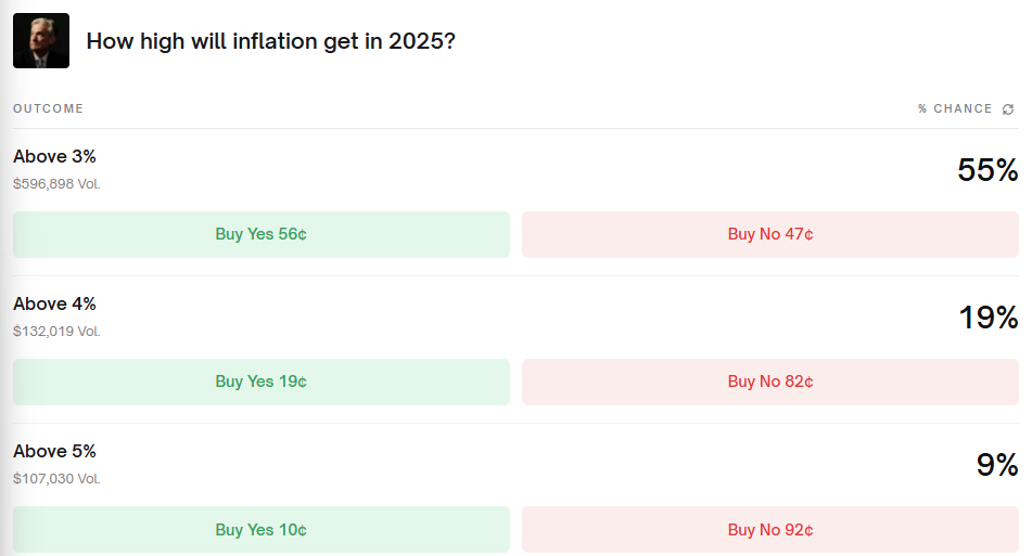 Prediction markets are actively pricing in various inflation scenarios for 2025. On Polymarket, traders are getting anxious about inflation rising to above 4%. The majority is still hovering at the 3% range, though.